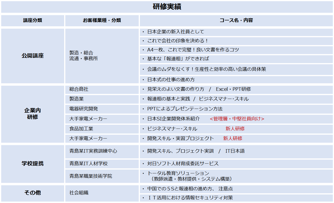 新入社員、幹部社員向けの企業內研修を提供し、お客様のニーズにあわせた最適なコースを提供できます。